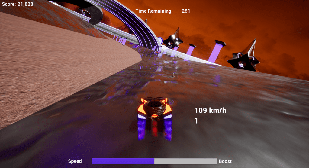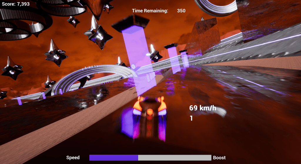 In Sound “Track”, the primary goal of the game is to collect as many points as possible within a fixed amount of time. Points are earned by smashing into purple pillars and jumping through energy-filled rings. All the while, adoring fans cheer you on from inside their observation ships. My primary goal for Sound “Track” was to create a high-octane experience, both from a gameplay and audio design perspective.