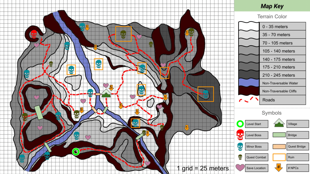 When I began developing Talon’s Blade, I struggled to determine how to display meaningful height information for a continuous landscape, and at the time, my ambition outpaced my ability. With more experience, I would solve the problem of displaying height data on a landscape by utilizing contour lines and color shading to represent both elevation gradients and non-traversable areas. Point of interest symbols provide at-a-glance information on content density and context. Critical paths through the levels are marked out, as well as the start and end points of the level.