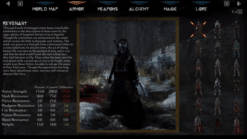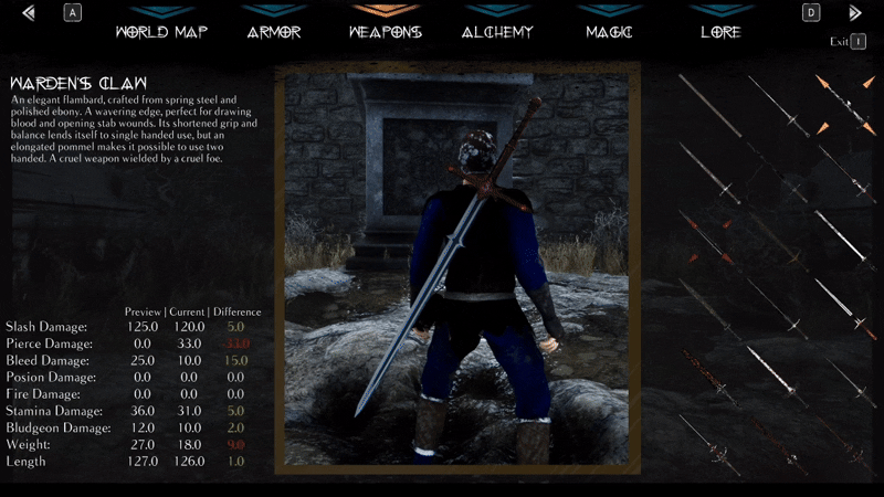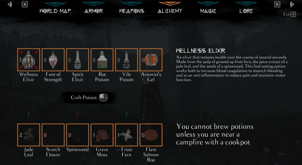 I wanted equipment and resources to serve as direct rewards for completing missions and exploration, and also as a means of player progression. There are eighteen unique weapons and eighteen unique armor sets that the player can discover. As the player progresses through the game, they will uncover new pieces of equipment that are specialized to face some foes or provide statistical trade-offs that can influence play style. In addition to combat equipment, the player can also find alchemical ingredients that are used to brew useful potions to aid in combat and exploration.